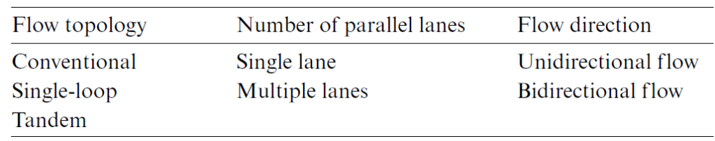 برای سیستم، یک قانون ترافیکی تک‌جهته با ایجاد حلقه‌هایی در شبکه پیشنهاد شده است که به‌طور قابل‌توجهی تضاد وسایل نقلیه را کاهش می‌دهد. مسئله کمینه‌سازی زمان کلی (makespan) در طراحی مسیرهای جریان یک‌طرفه بررسی شده است. مسائل تعیین حلقه حرکت AGV و محل ایستگاه‌های دریافت و تحویل (P/D) در سیستم‌های حلقه‌ای تک‌جهته بررسی شده‌اند.