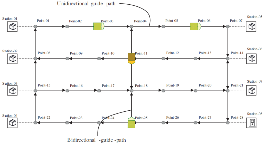 یک طرح جریان مسیر دوطرفه و الگوریتم مسیریابی ارائه شده است که می‌تواند مسیرهای بدون برخورد و کوتاه‌ترین زمان را برای AGVها تضمین کند. یک برنامه‌ریزی مسیریابی دوطرفه و الگوریتم انتخاب مسیر AGV پیشنهاد شده است. برای به حداقل رساندن فضای مورد نیاز برای طراحی نقشه، شرایط بحرانی برخی از پارامترهای کلیدی بین مسیرها و AGV استخراج شده‌اند تا طراحی مسیر و الگوریتم‌های مسیریابی پیچیده‌تری فراهم شود.